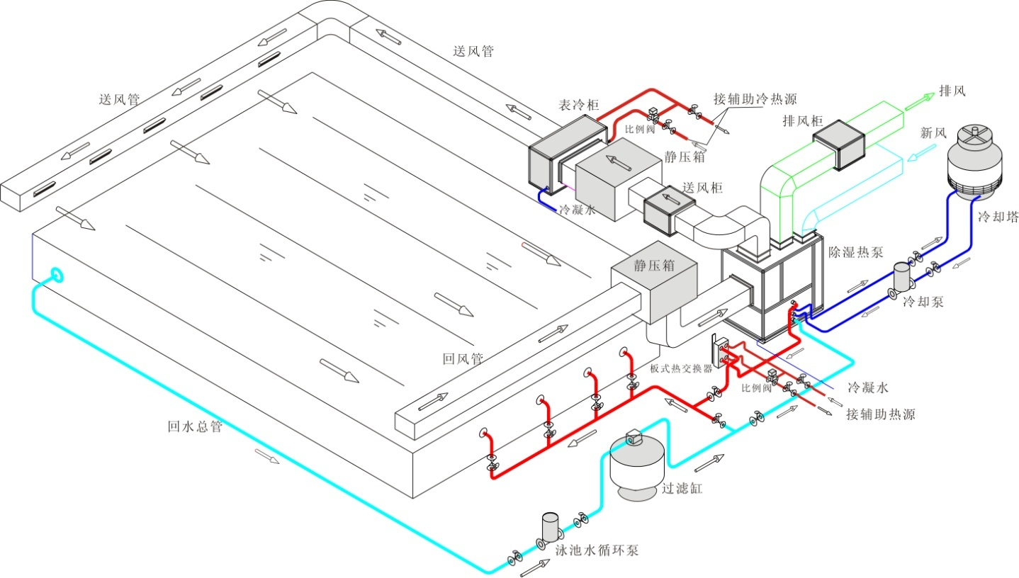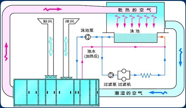 泳池除濕熱泵是回收泳池濕熱空氣除濕過(guò)程空氣水份冷凝釋放潛熱及空氣溫降顯熱通過(guò)壓縮機(jī)等熵壓縮做功至高品位熱能,一部分熱量用于加熱水維持泳池水的溫度,一部分用于加熱除濕后低溫低濕空氣,通過(guò)恒溫恒濕熱泵可以保持室內(nèi)空氣溫度、濕度及泳池水溫;夏季將除濕過(guò)程冷凝潛熱送至冷卻水水冷凝器通過(guò)冷卻塔向室外散熱(或室外風(fēng)冷凝器)實(shí)現(xiàn)泳池空間制冷除濕;